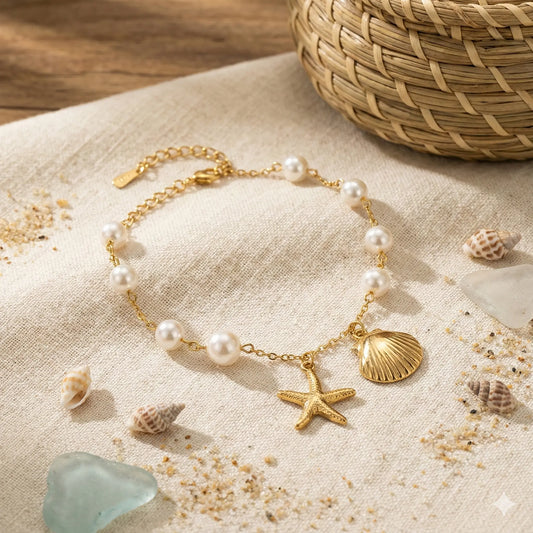 Ocean Pearl Charm Anklet with Golden Shell & Starfish Drops