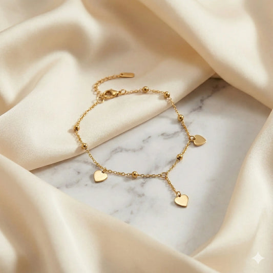 Golden Love Bead Anklet with Dainty Heart Charms & Luxe Polish